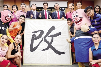 12月24日,在马来西亚吉隆坡举行的2012马来西亚年度汉字评选揭晓仪式上,主办方代表与年度汉字“改”合影。当日,由马来西亚中华大会堂总会、马来西亚汉文化中心和马来西亚华文报刊编辑人协会联合主办的2012马来西亚年度汉字评选在吉隆坡揭晓,最终“改”字当选马来西亚年度汉字。 张纹综摄(新华社发)