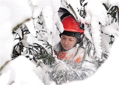 12月21日,在白俄罗斯首都明斯克北部130公里处的村庄,一名工人在覆满积雪的森林中砍伐新年用作装饰的树木。 (新华社发)