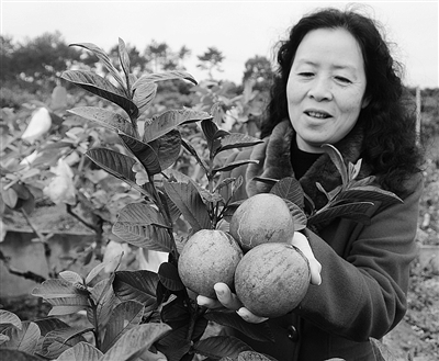 12月22日,福清琳鹏现代农业有限公司的汤美玉在展示刚采下来的从台湾引进种植的红芭乐果。截至目前,福清市台湾农民创业园已落户台资农业企业68家,总投资3.27亿美元。 新华社发