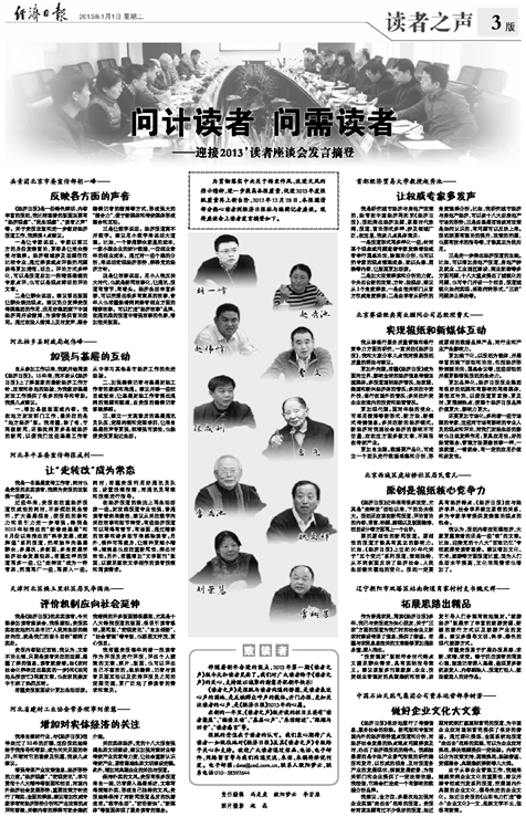 为贯彻落实中央关于转变作风、改进文风的指示精神,进一步提高本报质量,促进2013年度报纸质量再上新台阶,2012年12月28日,本报邀请部分热心读者到经济日报社与编辑记者座谈。现将座谈会上读者发言摘登如下。