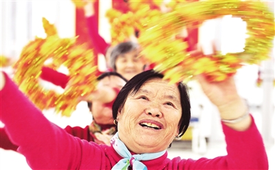 | 2012年12月31日,山东邹平县西王村老年公寓,老人们载歌载舞迎新年。养老保险覆盖面的不断扩大,让老人们的晚年有了保障。 |
