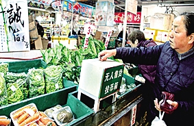 | 2012年12月31日,上海普陀区蓝田菜场,居民在选购蔬菜后自觉往投币箱内投币。思想道德建设的持续提高,是民生改善的重要标志。 |