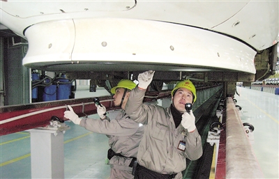 | 1月1日,上海铁路局动车组地勤机械师进行动车走行部检查。元旦假期,该客运段上千名员工奋战在一线,确保列车行驶安全。 |