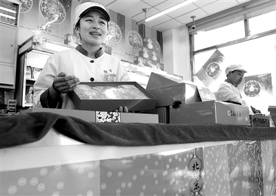 ▲ 1月2日,北京老字号稻香村年货柜台售货员杨春园(左)在为顾客介绍商品。新年来临,北京稻香村准备了丰富的节日食品,满足市民需要。