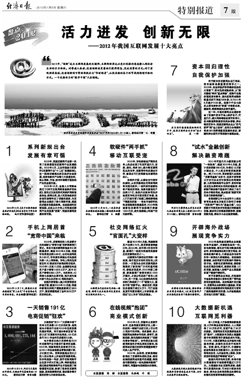 2012年,“创新”成为互联网发展的关键词,互联网经济也以更加迅猛的姿态渗入到社会生活的方方面面。对普通人来讲,这些创新改变着他们获得信息、完成消费的方式;对于宏观经济来说,这些创新则可帮助传统企业“华丽转身”,从供应链的各个环节找到转型升级的方式。一个充满活力的“数字中国”正在崛起。