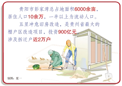 彭家湾位于贵阳市西南城郊接合部,涉及花果园、彭家湾、五里冲、小坪冲等村,总占地面积6000余亩,居住人口10余万,一半以上为流动人口,曾是贵阳最大的“城中村”之一。大半个世纪以来,村内危旧楼房林立,配套设施滞后,蚊蝇肆虐,秩序混乱,对当地居民的生活质量造成严重影响。加快改造棚户区,是时代的呼唤,民众的期盼,也是对政府执政能力的考验。