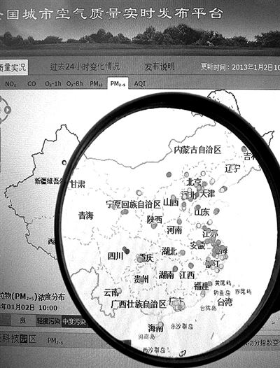 2013年1月1日,北京、广州等全国74个城市正式“升级”空气质量标准,并实时公布细颗粒物(PM2.5)等各项污染物的数据。上网查询实时空气质量成为更多普通市民的新习惯。