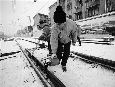 1月4日,南昌火车站工作人员在用汽油喷灯为道岔清除冰雪。 新华社记者 周 密摄