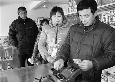 1月5日,河北望都县韩庄村村民排队在村内一家超市使用EPOS机进行刷卡消费。