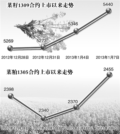 上市仅4日,菜籽、菜粕出现强劲走势。1月7日,菜粕主力1305合约收盘2455元/吨,上涨93元,涨幅3.94%,接近涨停板位置;菜籽主力1309合约日内最高涨幅达3.76%,后略有回落。