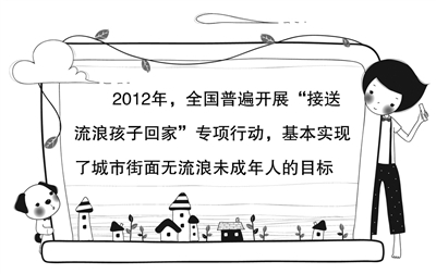 在去年年底召开的2013年全国救助工作会议上,民政部宣布,2013年,民政部还将会同有关部门联合开展“流浪孩子回校园”专项行动,切实做到街面发现一个就主动及时救助保护一个。同时,2013年还将规范流浪未成年人家庭寄养、支持重点县(市)流浪未成年人救助保护机构建设、发动社会力量参与流浪未成年人救助保护、探索开展未成年人社会救助保护工作。