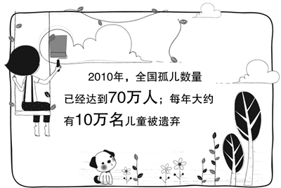 根据民政部的统计数据,2010年,全国孤儿数量已经达到70万人;《中国儿童福利政策报告》称,中国每年大约有10万名儿童被遗弃。