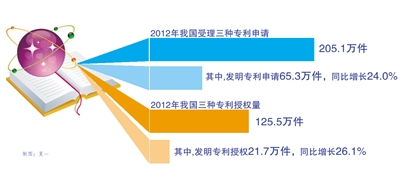 国家知识产权局局长田力普在此间介绍说,2012年,我国受理三种专利(发明专利、实用新型专利、外观设计专利)申请205.1万件、授权125.5万件,其中发明专利申请65.3万件,同比增长24.0%,发明专利授权21.7万件,同比增长26.1%。我国PCT(Patent Cooperation Treaty,专利合作条约)专利国际申请受理量2.0万件,同比增长12%。2012年7月,我国发明专利授权总量达到100万件。田力普表示,这说明我国正逐步由重视专利数量向重视专利质量转变,同时也标志着我国由专利大国向专利强国迈进。