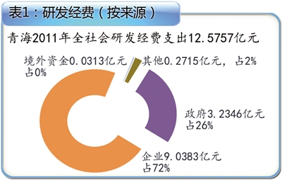 2011年,青海省全社会研发经费125757万元,比上年增长26.43%,研发经费与国内生产总值的比例为0.75%。(表1)