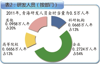 2011年,青海省全社会研发全时人员数0.5万人年,每万人专业技术人员数270.69 人。(表2)