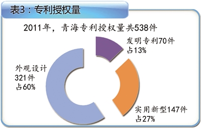2012年,青海省专利申请量为719件,获得授权专利495件,其中发明专利申请量为253件,授权95件,实用新型专利申请量为236件、授权196件,外观申请量为230件、授权204件,每万人有效发明专利拥有量为0.509件。2011年,青海专利授权量共538件。(表3)