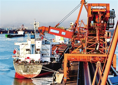 1月9日,一艘轮船靠泊在秦皇岛港煤炭码头装货。据介绍,从2012年12月至今,秦皇岛港在严寒天气下共装运煤炭2649万吨,日均装船比2012年11月提高11.3%,保证了南方电煤供应。 新华社记者 杨世尧摄