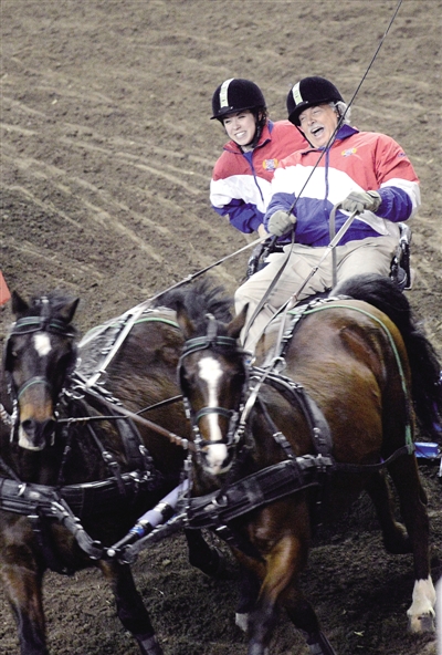 1月8日,在美国宾夕法尼亚州哈里斯堡举行的农场秀上,两名骑手参加场地马车技巧的表演赛。美国宾夕法尼亚州农场秀是美国国内最大的室内农业展。 (新华社发)