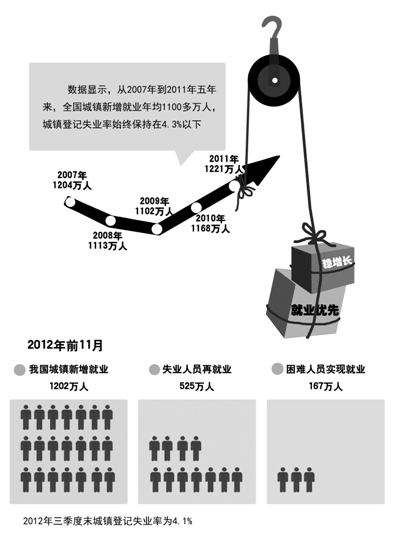 在世界经济普遍低迷的情况下,相对于一些国家失业率居高不下,我国就业状况可谓表现抢眼。2012年前11月,我国城镇新增就业1202万人,失业人员再就业525万人,困难人员实现就业167万人,三季度末城镇登记失业率为4.1%。
