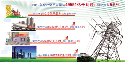 国家能源局14日发布数据显示,2012年,全社会用电量累计达49591亿千瓦时,同比增长5.5%。虽然总量有所增长,但和前两年相比,2012年全社会用电量增速明显下降。2011年全社会用电量同比增长11.7%,2010年同比增长达到14.6%。