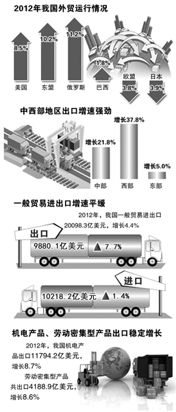 编者按 2012年,国际金融危机深层次影响继续显现,世界经济总体需求不足,新的增长潜能不明显。受此影响,中国对外贸易发展也面临严峻挑战。16日,商务部公布的数据显示,我国2012年进出口总值38667.6亿美元,与上年同期相比增长6.2%。进出口增速从两位数下滑至个位数。目前,我国已出台了系列措施来优化外贸结构、促进外贸稳定增长。本报记者日前就相关问题采访了商务部国际贸易经济合作研究院院长霍建国。