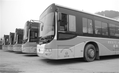 整装待发的清洁能源混合动力公交车(1月18日摄)。贵阳市日前宣布,贵阳公交全面完成“燃油改燃气”即“油改气”工程,全面实现车用燃料清洁化,成为中国目前使用液化天然气公交车数量最多的城市。 陶 亮摄(新华社发)