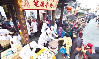 1月19日,杭州老字号药房门口数千市民排长队等候领取免费派送的养生腊八粥。当日是中国传统的腊八节,杭州许多药房、寺庙、餐饮店及社区免费向市民提供腊八粥,给寒冬的杭城增添了浓浓暖意。