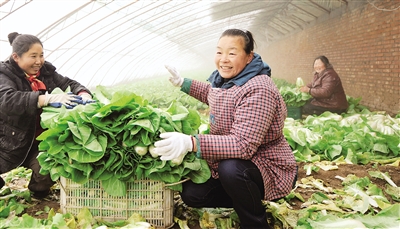 图为1月20日,北京大兴区礼贤镇田园鑫盛蔬菜大棚,来自四川的叶大姐(中)正在采收蔬菜。