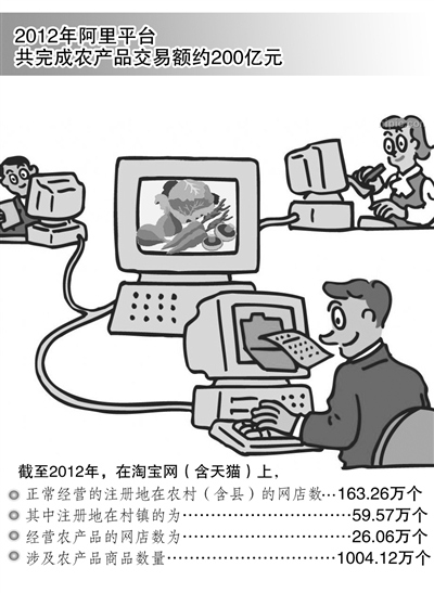 阿里巴巴集团研究中心陈亮介绍,2010年我国进入流通流域的农产品价值总额为2.24万亿元,2012年阿里平台农产品销售额约200亿元,尚不足1%,潜力巨大。