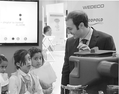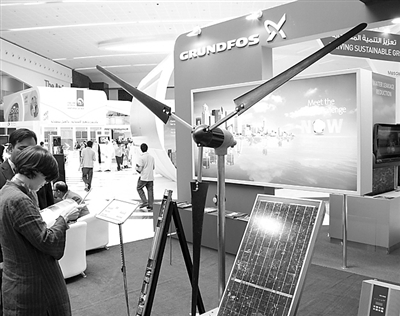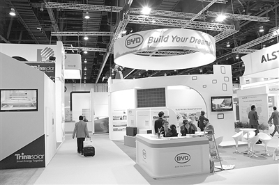 图② 中国比亚迪公司展台。比亚迪在本届峰会上与德国西门子公司和日本夏普公司一同入围“扎耶德未来能源奖”大企业奖。