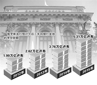 俄罗斯央行继续努力遏制银行信贷可能出现的下滑,增加向银行注资,以便银行扩大净贷款。俄罗斯央行预计未来3年中,2013年向银行发放净贷款预计增长至2.62万亿卢布,2014年为3.76万亿卢布,2015年达到5.31万亿卢布。而这一数字在2012年仅为1.99万亿卢布。