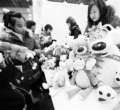 1月24日,一家外贸企业的工作人员(右)在展会上向顾客销售外贸长毛绒玩具。