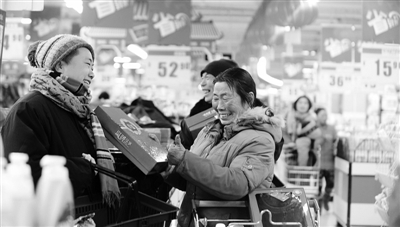 1月23日,领到爱心卡的群众在超市内选购年货。新春佳节临近,江苏扬州广陵区连运社区与爱心商家一起开展“慈善超市爱心卡”送温暖活动,为社区内的65户困难群众和残疾人等特殊群体发放了春节慈善超市爱心卡。 孟德龙摄(新华社发)