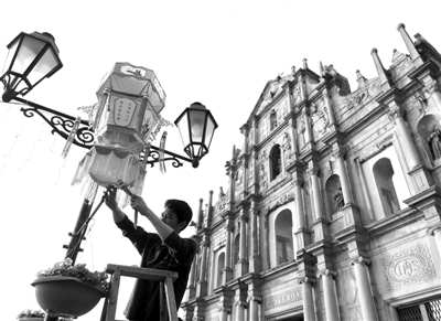 1月21日,澳门特区民政总署工作人员在澳门大三巴前挂新年灯笼。随着农历新年的临近,澳门特区民政总署人员在市区张灯结彩,为新春佳节营造气氛。 张金加摄(新华社发)