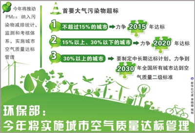 环保部部长周生贤表示,PM2.5治理既是“攻坚战”又是“持久战”,要采取综合措施加大力度治理,2013年在113个环保重点城市和环保模范城市开展包括PM2.5在内的6项指标监测,确保2015年重点区域空气中PM2.5年均浓度下降5%,京津冀、珠三角、长三角区域年均浓度下降6%。