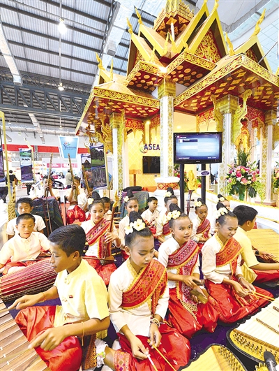 1月23日,在老挝首都万象的万象会展中心举行的旅游推广展览上,身着传统服装的孩子们用传统乐器演奏。2013年东盟旅游论坛举办期间,万象会展中心于1月21日至24日举办大型旅游推广展览,集中推介东盟各国的旅游文化。 新华社发
