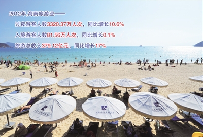 近年来,海南旅游市场发展迅速。2012年,海南省接待过夜游客人数3320.37万人次,同比增长10.6%,接待入境游客人数81.56万人次,同比增长0.1%,实现旅游总收入379.12亿元,同比增长17%。5年来,海南接待过夜游客人数累计达13219.38万人次,旅游业收入累计达1364.84亿元。
