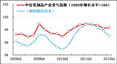 在进一步剔除随机因素后,四季度中经乳制品产业景气指数为97.0(见中经乳制品产业景气指数走势图中的蓝色曲线),比未剔除随机因素的中经乳制品产业景气指数(红色曲线)低1.3点,说明乳制品行业自身增长基础仍不扎实。