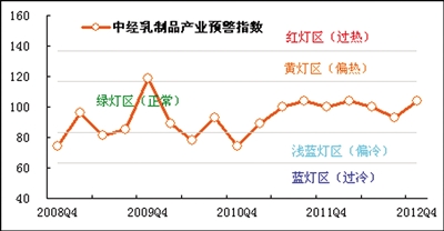 2012年四季度,中经乳制品产业景气指数为98.3,与上季度基本持平。中经乳制品产业预警指数为103.7,较上季度大幅回升11.1点,上升至“绿灯区”中心线以上区域。