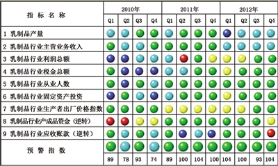 四季度,在构成中经乳制品产业预警指数的9个指标(仅剔除季节因素,保留随机因素)中,位于“红灯区”的有1个指标——乳制品行业应收账款(逆转);位于“黄灯区”的有1个指标——乳制品行业产成品资金(逆转);位于“绿灯区”的有5个指标——乳制品行业利润总额、税金总额、从业人数、固定资产投资和生产者出厂价格指数;位于“浅蓝灯区”的有2个指标——乳制品产量和乳制品行业主营业务收入。