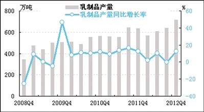 2013年随着库存调整接近尾声以及奶源问题的逐渐缓解,乳制品生产量有望回归常态。