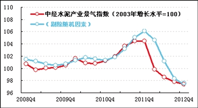 2012年四季度,中经水泥产业①景气指数为97.5(2003年增长水平=100),较上季度下降0.3点,降幅继续收窄。