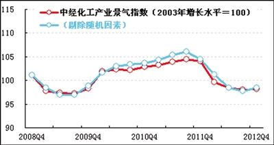 2012年四季度,化工产业生产合成指数为99.4(2003年增长水平=100),与三季度持平。