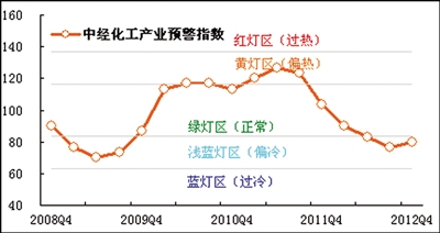 2012年四季度,中经化工产业景气指数为98.2,较上季度上升0.2点,表明化工产业景气状况止跌回升;同时,中经化工产业预警指数为80,较上季度上升3.3点,接近“绿灯区”底部。