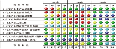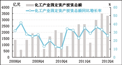 2012年,化工产业投资增速整体呈现前高后低的走势,三、四季度投资增速持续下降,反映出我国产业结构调整正在逐步取得成效。结合预警灯号图来看,固定资产投资目前已回落至正常的“绿灯区”内,投资增长水平趋于正常。