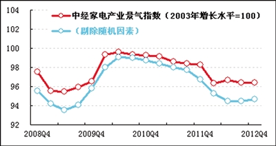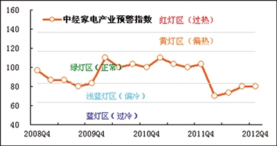2012年四季度,中经家电产业景气指数为96.4,较上季度持平;中经家电产业预警指数为80.0,与上季度持平,运行于偏冷的“浅蓝灯”区。