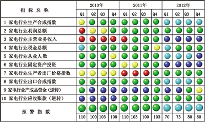 四季度,中经家电产业预警指数为80.0,较上季度持平,继续运行在偏冷的“浅蓝灯”区,但已经接近“绿灯区”的下沿。在构成中经家电产业预警指数的10个指标中,位于“黄灯区”的有1个指标;位于“绿灯区”的有5个指标;位于“浅蓝灯区”的有1个指标;位于“蓝灯区”的有3个指标。