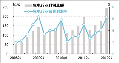 由于大宗原材料价格平稳回落,家电成本压力持续缓解,本季度家电业经济效益继续好转。经初步季节调整,四季度家电行业利润总额为244亿元,同比增长24.3%。四季度家电行业销售利润率为5.1%,较上季度上升1.1个百分点。
