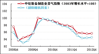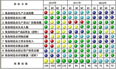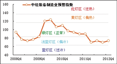 2012年四季度,中经装备制造业景气指数为95.6,与三季度基本持平,平稳运行中略显向好迹象;中经装备制造业预警指数为73.3,比三季度回升3.3点,在正常偏冷的“浅蓝灯区”呈回升态势。