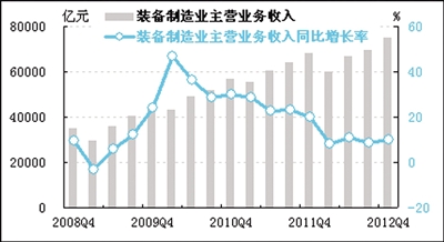 经初步季节调整,四季度装备制造业主营业务收入为74794.8亿元,同比增长9.9%,增速比三季度回升1.4个百分点。